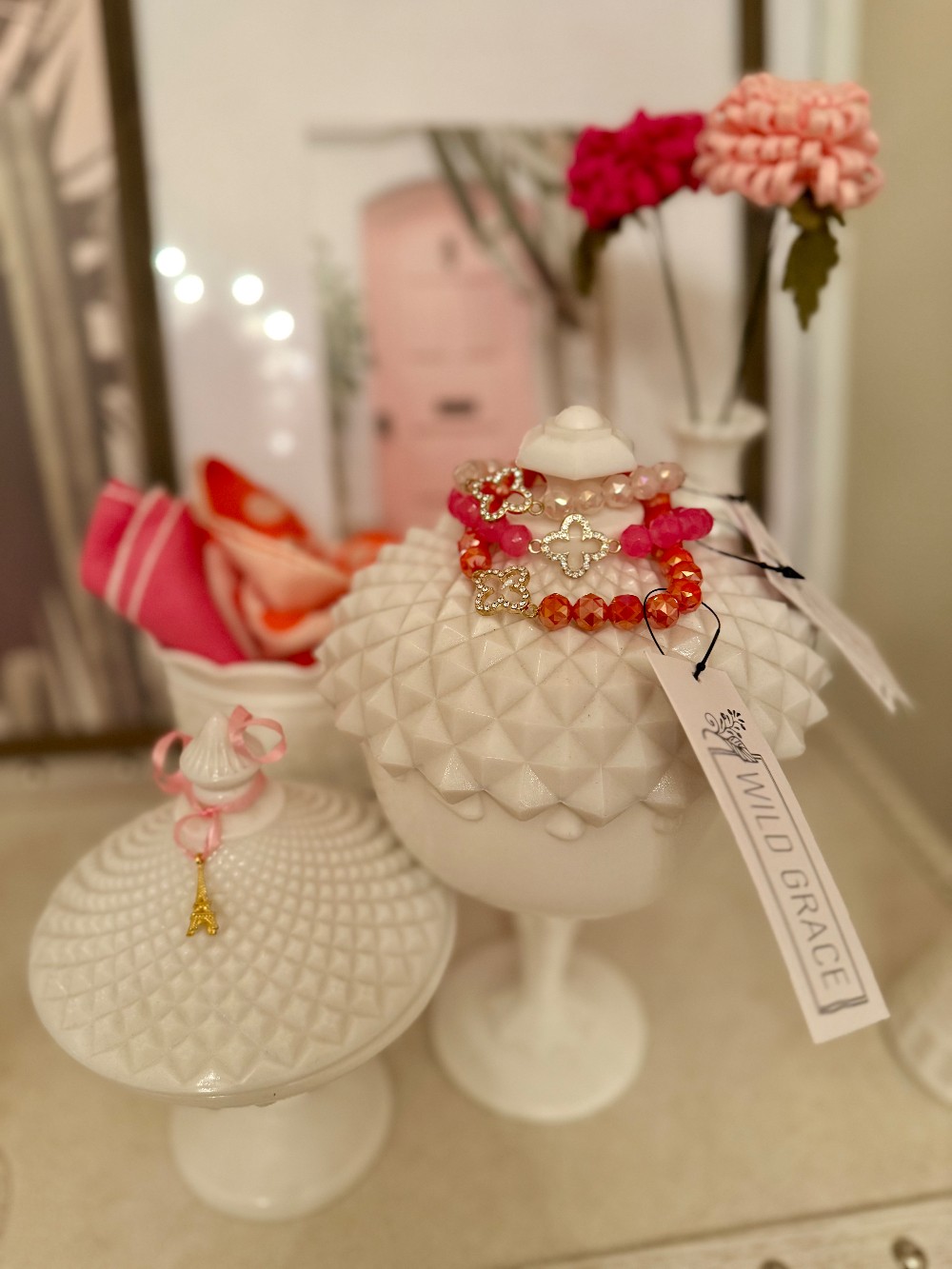 Collect other stackables and have a wrist party! Super sparkle pink with a crystal + gold charm stretch.
