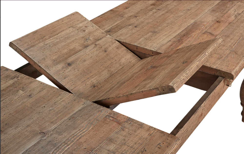 This gorgeous table will stretch to accommodate your largest holiday gatherings with its concealing butterfly leaf. Reclaimed pine with a family friendly clear coat finish is used to craft this beautiful table. The neutral wood tone allows you to use your imagination when selecting your chairs. Listing is for the Dining Table Only.