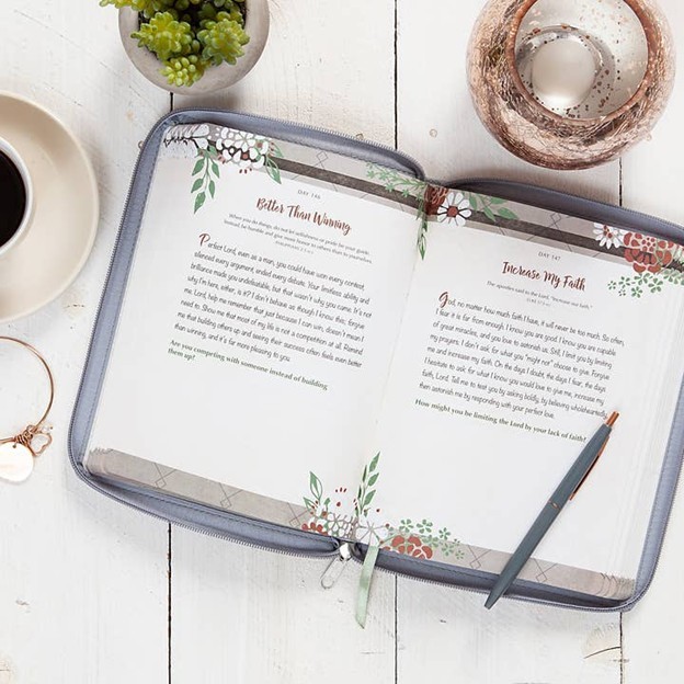 This elegant daily ziparound devotional journal features a beautifully designed interior with inspiring devotions, encouraging Scriptures, thought-provoking questions, and space for journaling.