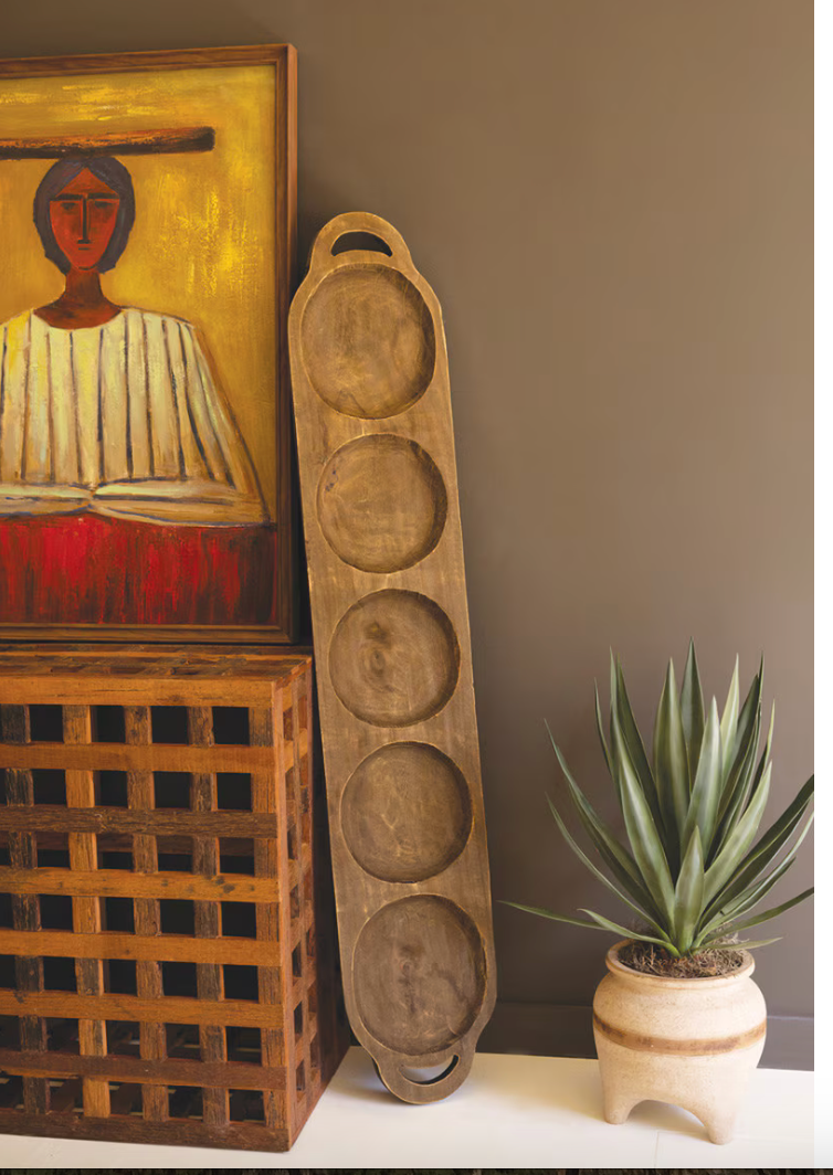 This long oval wood tray is more than a serving piece. Its smooth, elongated form and rich dark finish give it a sculptural quality that instantly draws the eye. The organic curve of the wood creates a bold, artistic presence on any table or countertop. Styled with fruit, seasonal greens, or left completely unadorned, it stands on its own as a striking statement piece that brings warmth and natural beauty to your home.