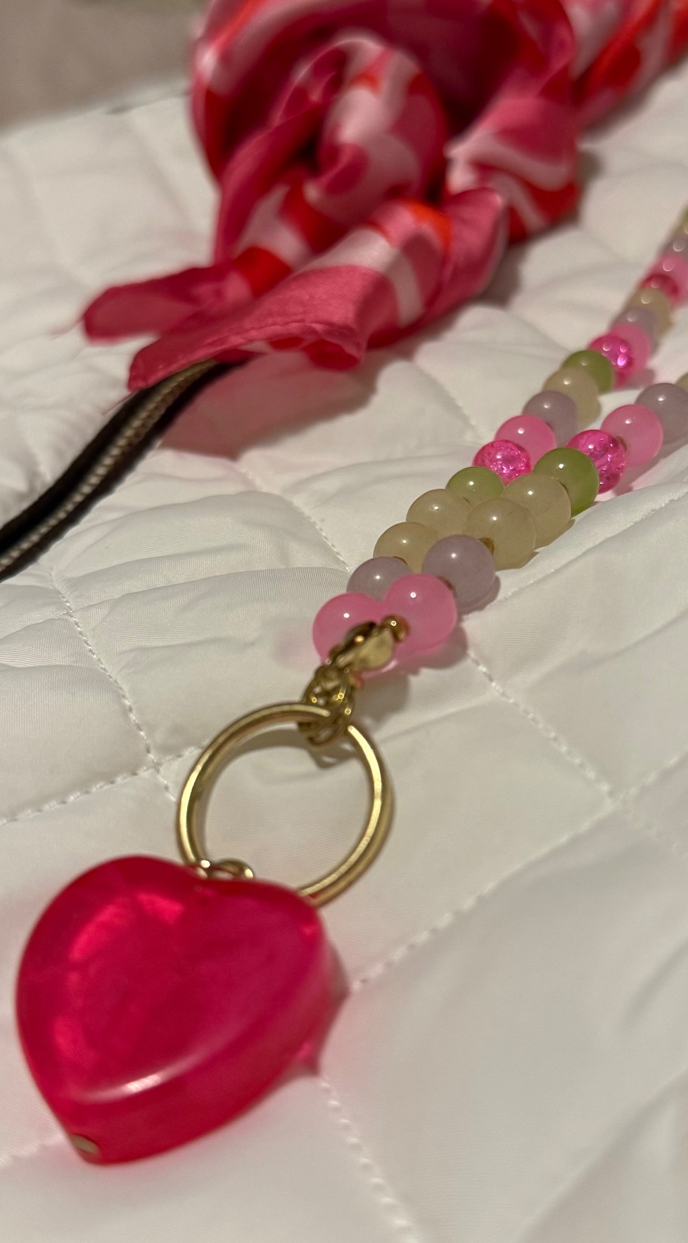 Long layering necklace...lucite + gold with happy love vibes! Hot pink heart with asst'd colored beads with gold spacers.